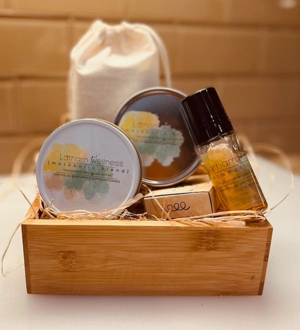 Latham Wellness [metabolic blend] appetite suppressant candle and pulse point therapy roll-on is a proprietary balanced blend of essential oils developed by clinical researchers created to curb hunger cravings and promote mindful eating.